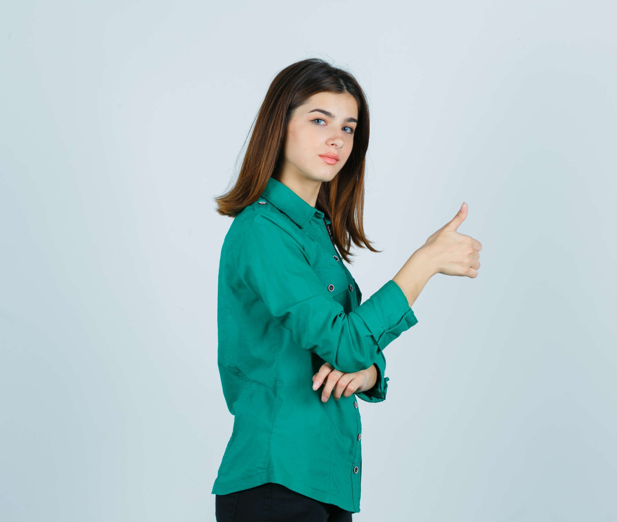 beautiful young lady in green shirt showing thumb up and looking confident .