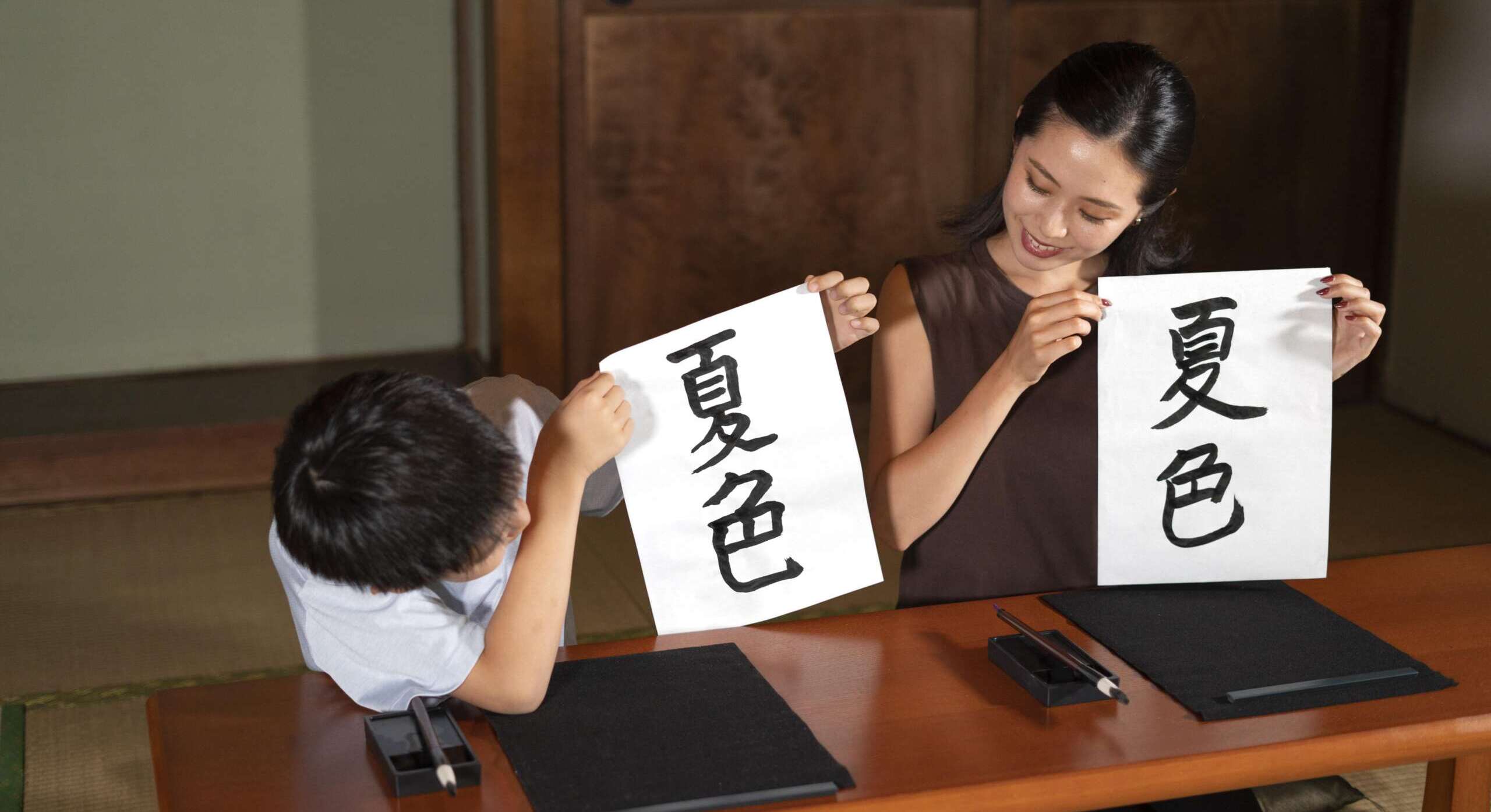 close-up-pupils-doing-japanese-calligraphy-called-shodo