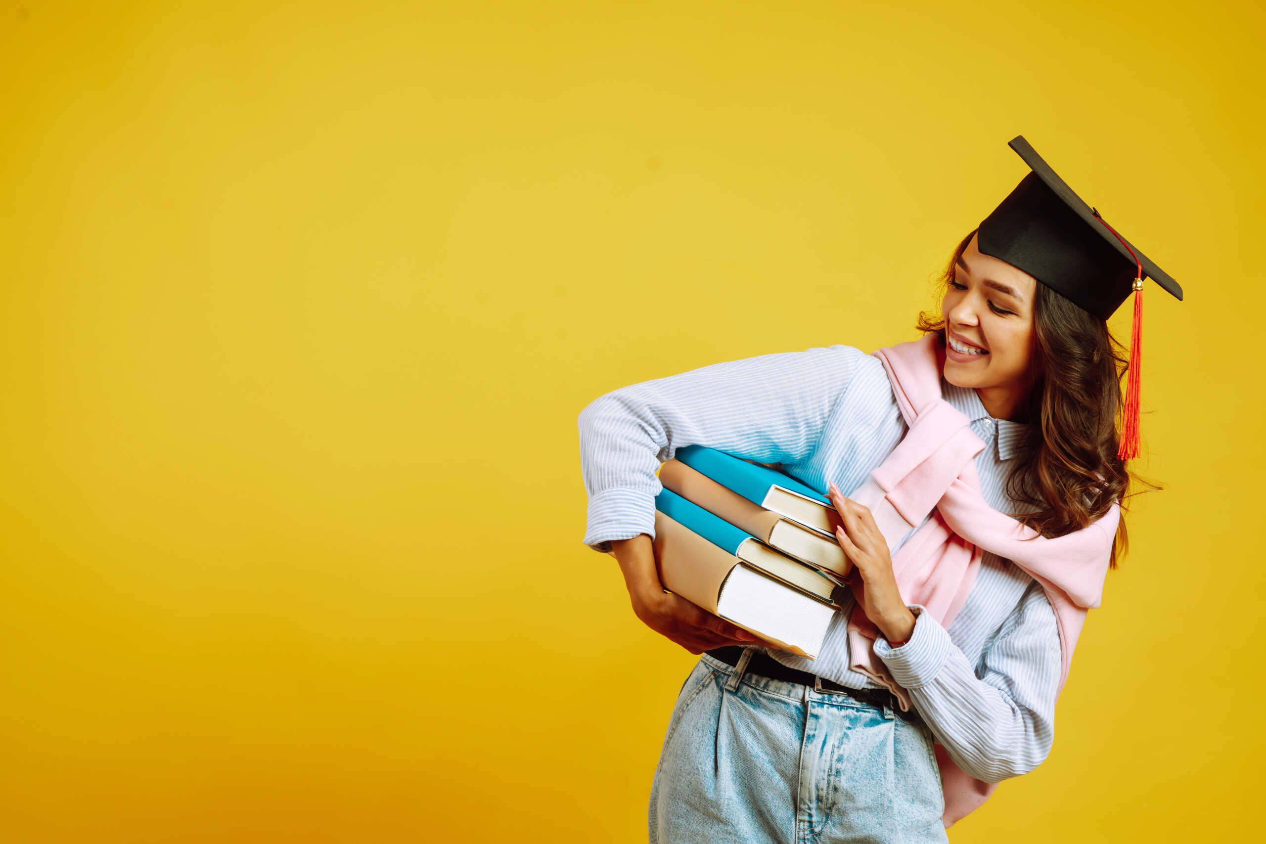 Graduate woman in a graduation hat on her head, with books stands on a yellow background.
